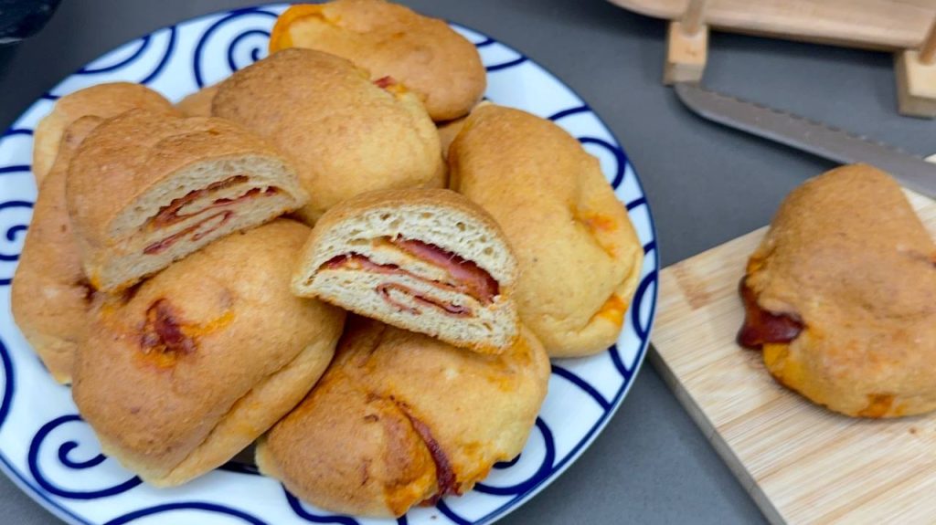 Colocar todos os ingredientes, excepto as carnes frias/enchidos/fumados,numa taça e mexer muito bem, cerca de 3 minutos – usei a batedeira KMix da Kenwood. Envolver as carnes frias/enchidos/fumados na massa.