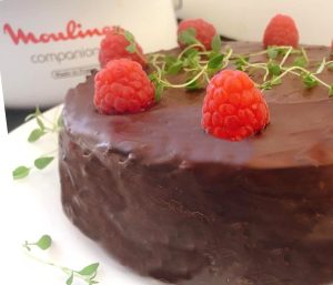 Para a cobertura, colocar 700ml de água na taça principal. Colocar a mini taça na taça principal, equipada com a lâmina picadora e adicionar todos os ingredientes. Derreter o chocolate em ” banho maria” ( velocidade 5, 100°,18 minutos). No final, juntar a essência e cobrir o bolo.