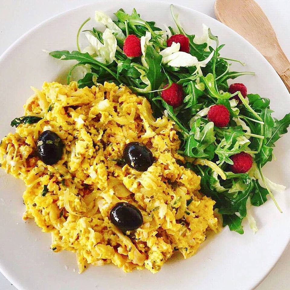 Envolva bem e por fim junte os ovos batidos com a curcuma, o sal e pimenta. Mexa até ficarem no ponto de confeção que lhe agrade. Polvilhe com salsa e coentros e sirva.