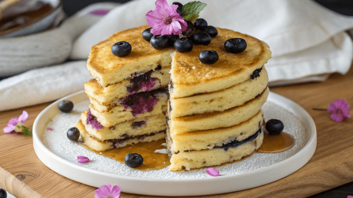 Estou apaixonada por estas Panquecas de Mirtilos! São uma delícia fofa, bonita e elegante, com um sabor irresistível! As claras batidas em castelo conferem-lhes uma textura leve e aerada, enquanto os mirtilos, ao cozinharem, libertam um doce meio caramelizado de comer e chorar por mais.