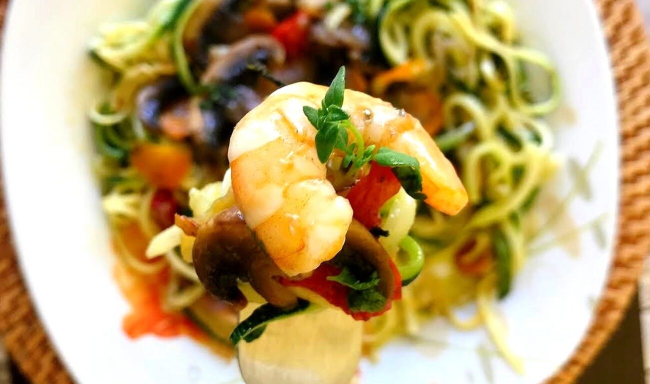Zoodles, ou por outra, courgette espiralizada, são uma excelente alternativa às massas. Não só porque têm muito menos hidratos, mas também porque são muito mais interessantes a nível nutricional. O truque, para mim, é não deixar cozinhar muito, caso contrário ficamos com algo mais semelhante a puré do que propriamente a esparguete. Basta só saltear na frigideira o suficiente para ficarem quentes e servir logo.